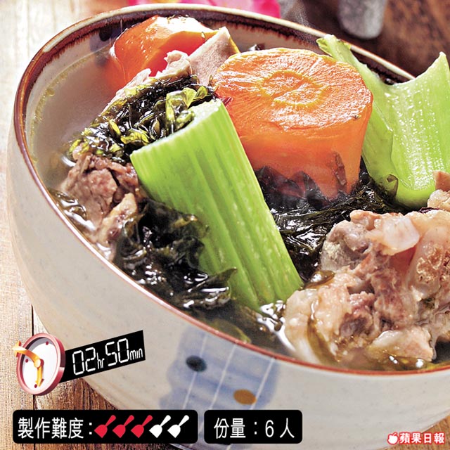 4. 最後加入紫菜及西芹,以大火煲滾後再收細火 30分鐘,加鹽調味即成。