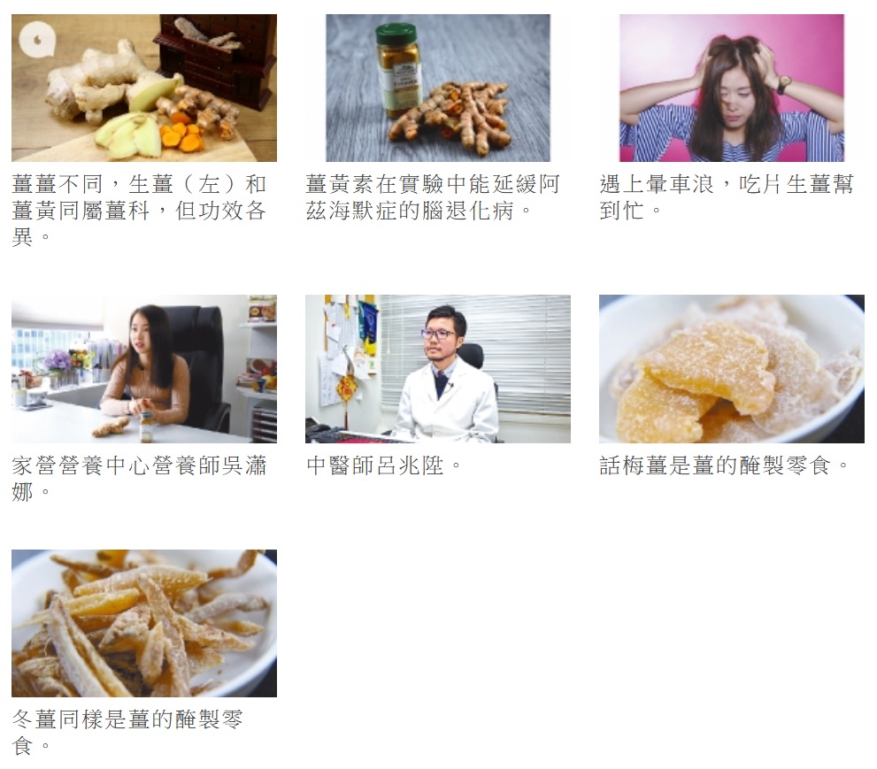 「生薑裏除了有薑辣素外,還有薑酮和薑酚成份,主要功效可以幫我們減少一些炎症的發生,特別老人家有關節炎情況,可以幫助紓緩,又能降低慢性疾病的風險特別是心血管疾病或是癌症。薑裏頭有一種成份,可以助止暈和止嘔的,會建議人們暈車浪時,可以帶備幾片薑。這些薑可以令我們腦神經對暈的反應降低。」「另外有些女士容易經痛,我們都會建議她們吃吃生薑,因為經痛的原因是子宮裏血塊形成有血瘀情況,生薑中的薑辣素可助血液循環好一點,令血塊分解暢順排出,制止到經痛的情況。」