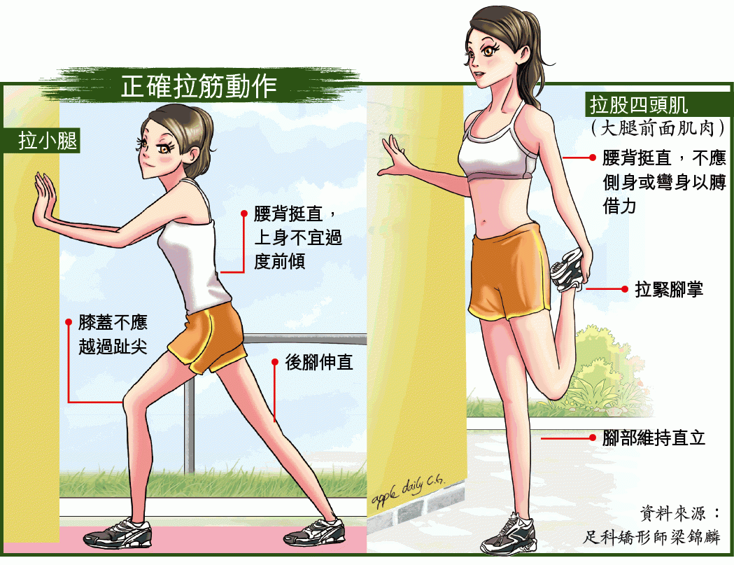 至於牽拉股四頭肌時,身體也要保持挺直,不應借力於肩膀或腰部,亦不宜拉動腳部時傾側身體。