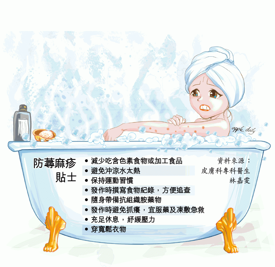 皮膚忽然痕癢無比,並出現粉紅色凸起斑塊,隨時是俗稱「風赧」的蕁麻疹發作。皮膚科醫生指出,引致蕁麻疹的原因有很多,冬天發作的誘因多與飯局或派對時大魚大肉,或穿太緊身衣服及用過熱的水沖涼有關,小兒發病則多見於感染後。若經常蕁麻疹發作,宜隨身帶備抗組織胺藥物服食,能加快症狀消退,並撰寫飲食紀錄,找出與病發相關的元凶。