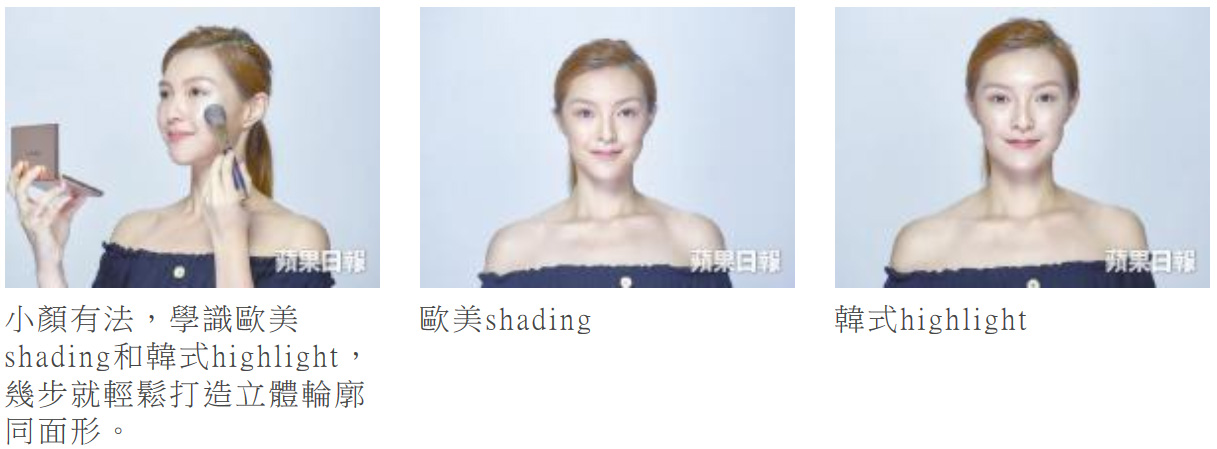 歐美及韓式修容大行其道,前者注重輪廓的深邃感,外國人的長直鼻樑和飽滿顴骨,單靠shading就可輕易打造,效果出神入化。至於後者,重點在於光澤感,以不同色調的highlight,輕掃面容,營造自然透亮的立體面形。