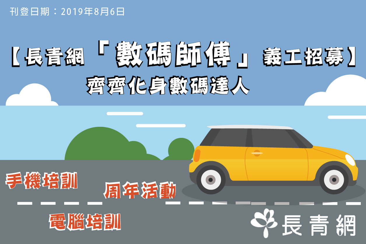 長青網現正招募喜歡上網、喜歡分享和同聲同氣的您成為「數碼師傅」義工,在長青網分享長者生活資訊,如飲食、旅遊心得,並協助推廣長青網。