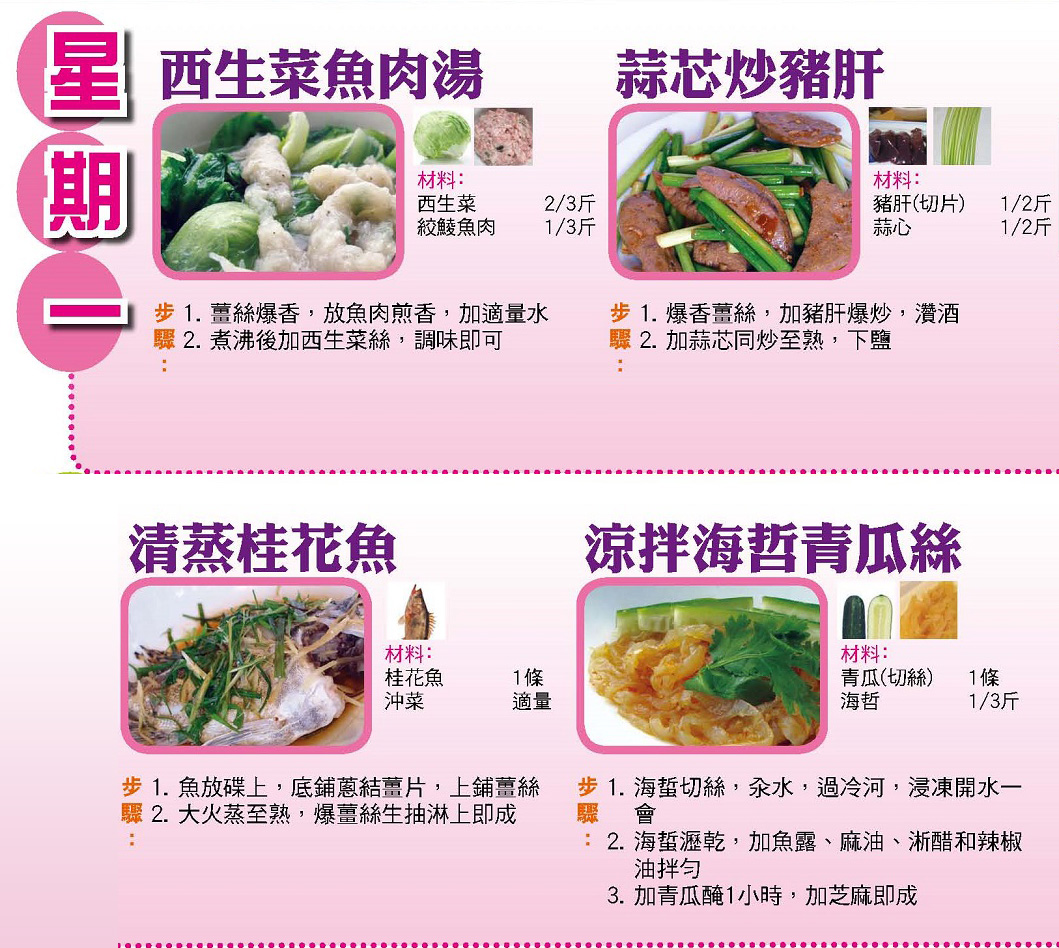 | 星期一 西生菜魚肉湯 蒜芯炒豬肝 清蒸桂花魚 涼拌海哲青瓜絲 |