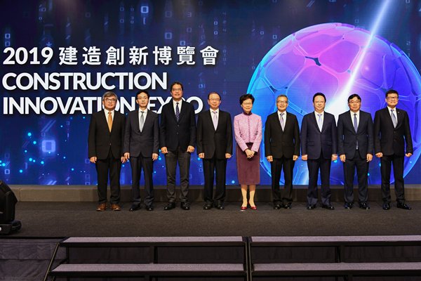 創新建築: 林鄭月娥(中)、黃偉綸(左三)、易軍(左四)出席「2019建造創新博覽會」開幕典禮。