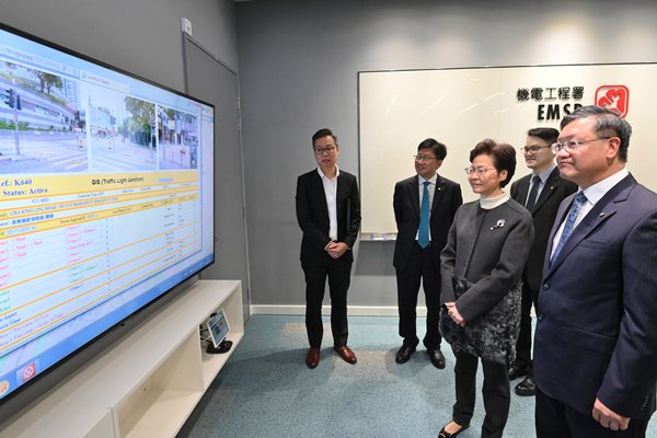 靈活應變: 林鄭月娥(左三)到訪機電工程署,聽取有關監察交通燈系統運作的簡介。