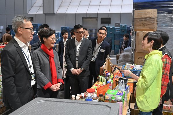 林鄭月娥在警務處處長鄧炳強陪同下,了解警方為前線執勤人員提供的膳食安排,並為前線人員打氣,感謝他們過去一年在極其嚴峻的環境中專業地執行職務,維持治安。她又特別感謝在場義工,過去多月以實際行動支持警隊。