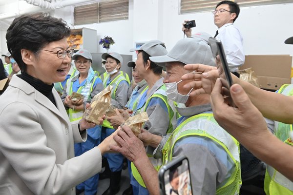 林鄭月娥與約50名清潔工人見面和交談,了解他們的工作情況,並向他們送上曲奇餅,感謝他們連月來在暴力衝突頻繁的旺角通宵達旦清理路障和雜物,以趕及早上大量市民出行前完成基本清理工作。